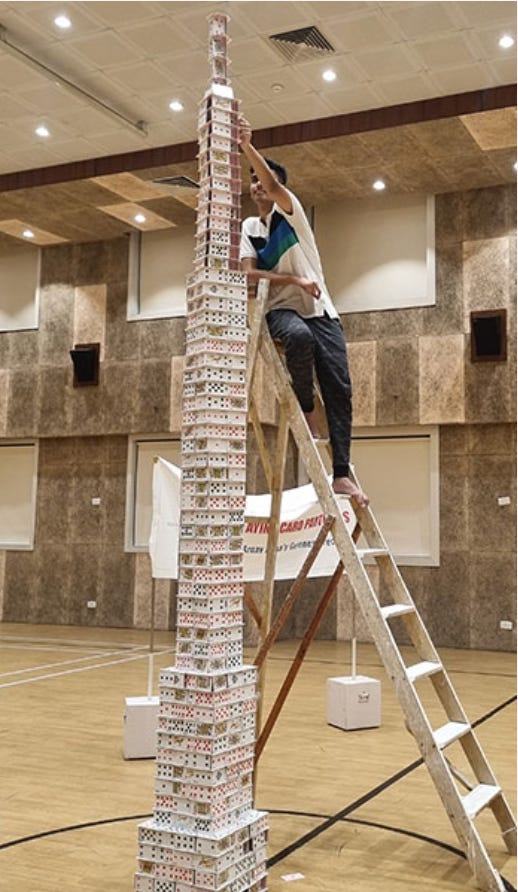 Then there is Arnav Daga, a competitive card-stacker from India, who hit the trifecta when he built a skyscraper of playing cards 61 levels high, setting records for the world’s tallest stack of cards in the 8-hour, 12-hour and 24-hour categories. A Chinese rival, Tian Rui, has since reclaimed the 8 and 12-hour records, but Daga isn’t about to fold his deck.